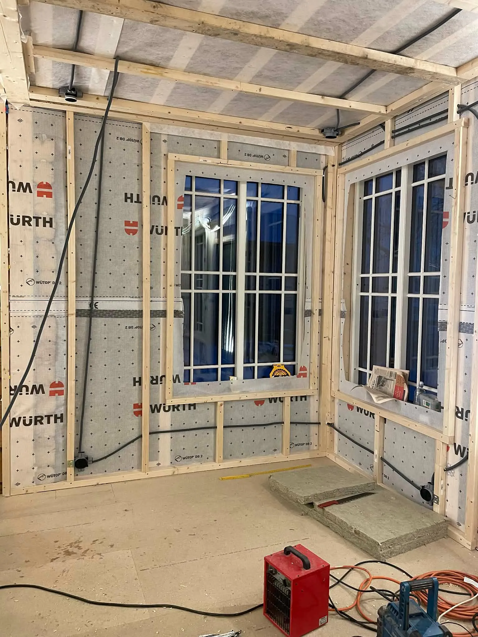 Innbygging glassveranda til stue i gårdsbygning med ny grunnmur.